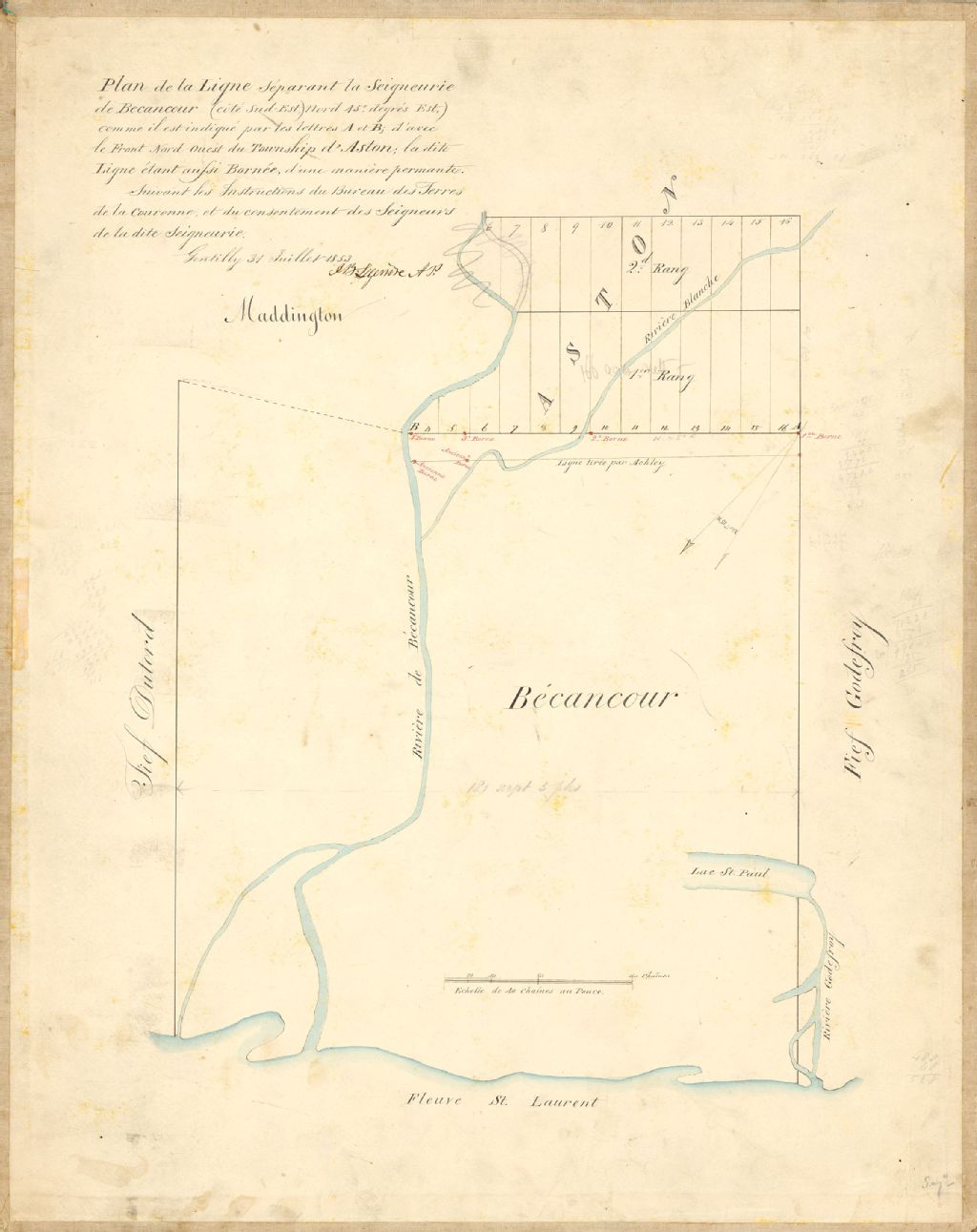 Seigneurie de Bécancour. Plan montrant la ligne de division entre le canton d'Aston et la seigneurie de Bécancour