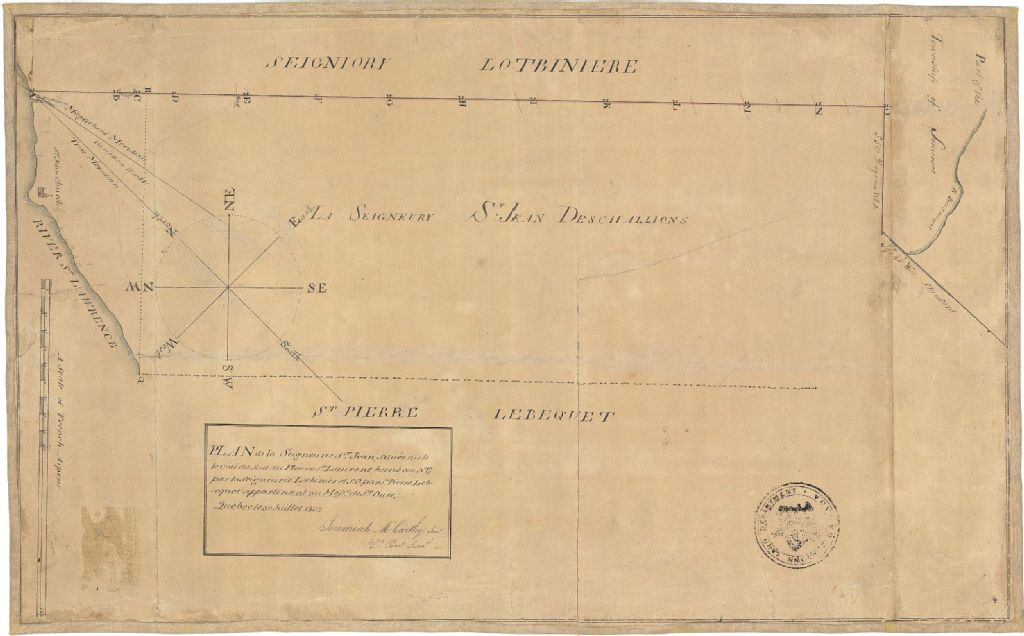 Plan de la seigneurie Saint-Jean, située sur le côté sud du fleuve Saint-Laurent, borné au nord est par la seigneurie de Lotbinière et sud ouest par la seigneurie St-Pierre Lebequet