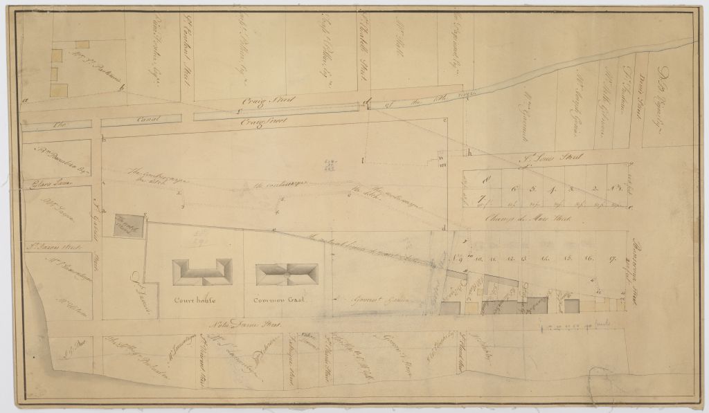 Sur ce plan des environs du Champ de Mars situé dans la ville de Montréal figurent la rue Craig, la rue Notre-Dame, la rue Saint-Gabriel, le numéro des lots et le nom des propriétaires. On y retrouve également les bâtiments, le canal, le palais de justice, l'église écossaise, la prison, le fossé et le jardin du gouvernement
