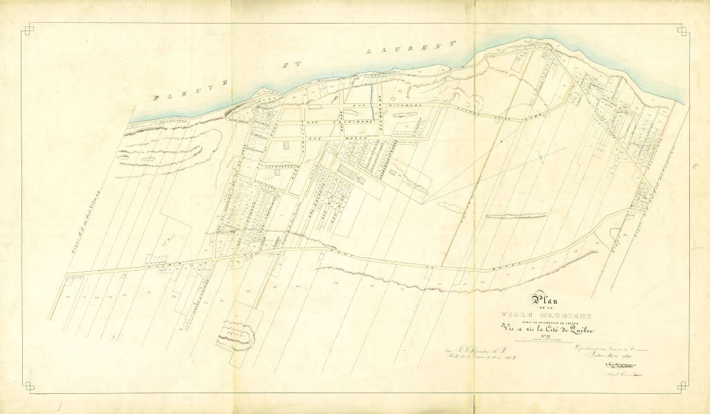 Seigneurie de Lauzon. Plan de la ville d'Aubigny (Lévis), comprenant les lignes suivantes: ligne Nord-Est du Fief Vilmay, ligne Nord-Est du fief des Jésuites, et ligne Sud-Ouest du fief des Ursulines