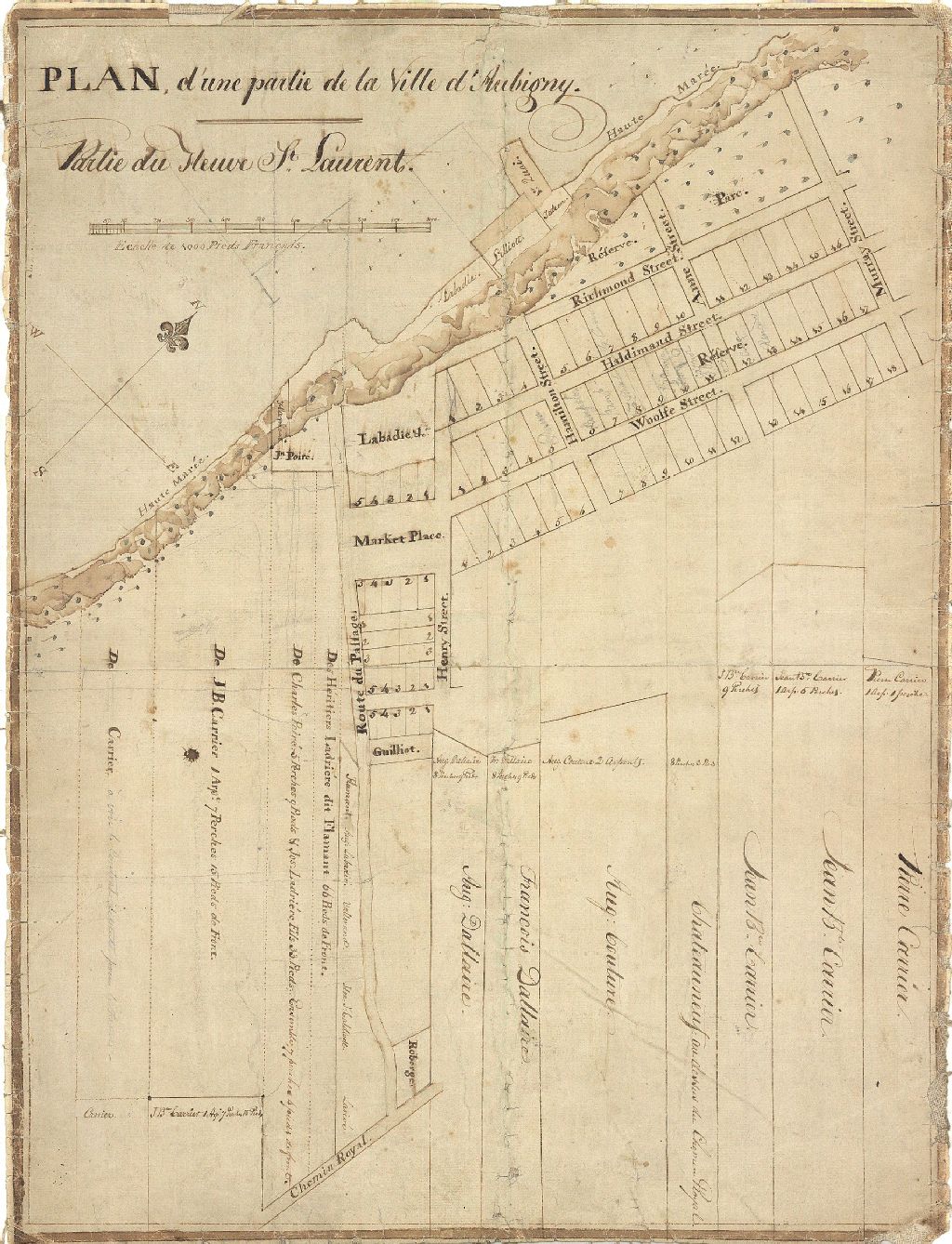 Sur ce plan de la ville d'Aubigny et du quartier Notre-Dame de la ville de Lévis figurent la côte du Passage, la rue Wolfe, une partie du fleuve Saint-Laurent, la rue Fraser et la rue Saint-Jean. On y retrouve également le relief, les rues, le numéro des lots, les limites de la marée haute, les quais, la végétation et une quinzaine de noms, entre autres les noms suivants: Labadie, Lilliott, Poiré, Flamand, Carrier, Caldwell, Vallerand, Larivée, Roberge, Dallaire, Couture et Chateauneuf