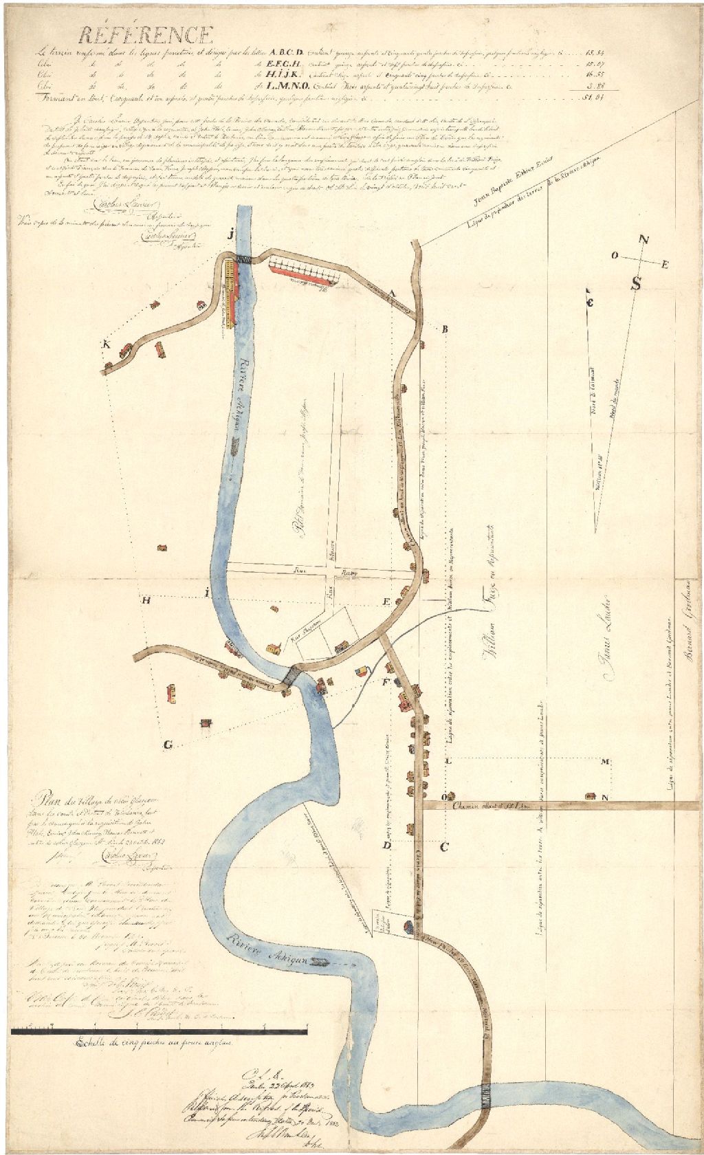 Sur ce plan d'une partie du village New Glasgow figurent la rivière de l'Achigan, la rue Shepstone, la rue Raby, la rue Masson et le chemin de la Tannerie. On y retrouve également les bâtiments, le hangar à écorce, la tannerie, les ponts, l'église écossaise, les chemins, la division des lots et le moulin. Figurent également sur le plan, les noms suivant : dame veuve Joseph Masson, William Furze, James Lauder, Bernard Goodman, héritiers Lloyd et Jean-Baptiste Ethier