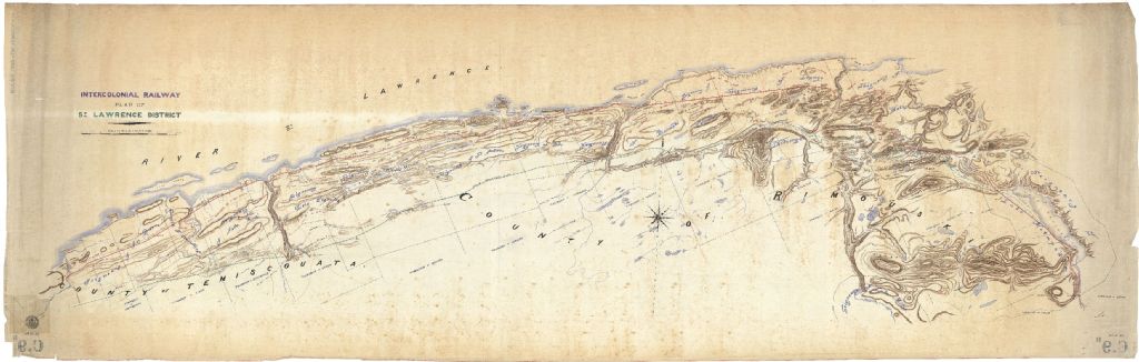Sur ce plan du tracé du chemin de fer Intercolonial, entre Rivière-du-Loup et le lac Témiscouata, figurent les seigneuries suivantes: Laparc, Devilleray, Isle Verte, Trois-Pistoles, Nicolas-Rioux, du Bic, Rimouski, Lessard, Lepage-et-Thivierge, de Mitis, du Lac-Mitis et du Lac-Matapédia; les cantons suivants: Massé, Cabot, Awantjish, Nemtayé, McNider, Neigette et Fleuriau; une partie du fleuve Saint-Laurent, le lac Matapédia, la rivière Tartigou, la rivière Mitis, la rivière Neigette, la rivière Rimouski, la rivière du Bic, le lac Saint-Simon, la rivière des Trois Pistoles et la rivière du Loup. On y retrouve également le mont Bois Brûlé, le mont Camille, les monts Chic-Chocs ou Notre-Dame, le mont Sugar Hillrange, le mont Burnt, le mont Mill Rige, le relief, les îles, le chemin de fer projeté, le millage, la réserve indienne, l'emplacement des Amérindiens et le réseau hydrographique. De plus, sur ce plan figurent les villages, les