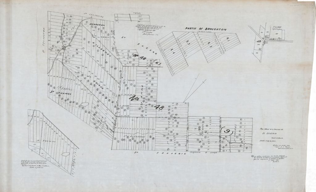 Sur ce plan de la paroisse Saint-Séverin figurent une partie des seigneuries de Sainte-Marie et Saint-Gilles, une partie du Canton Broughton, une partie de la paroisse de Beaurivage, la rivière Beaurivage, le cadastre officiel et abrégé, l'église, le nom des concessions, les chemins et le lac