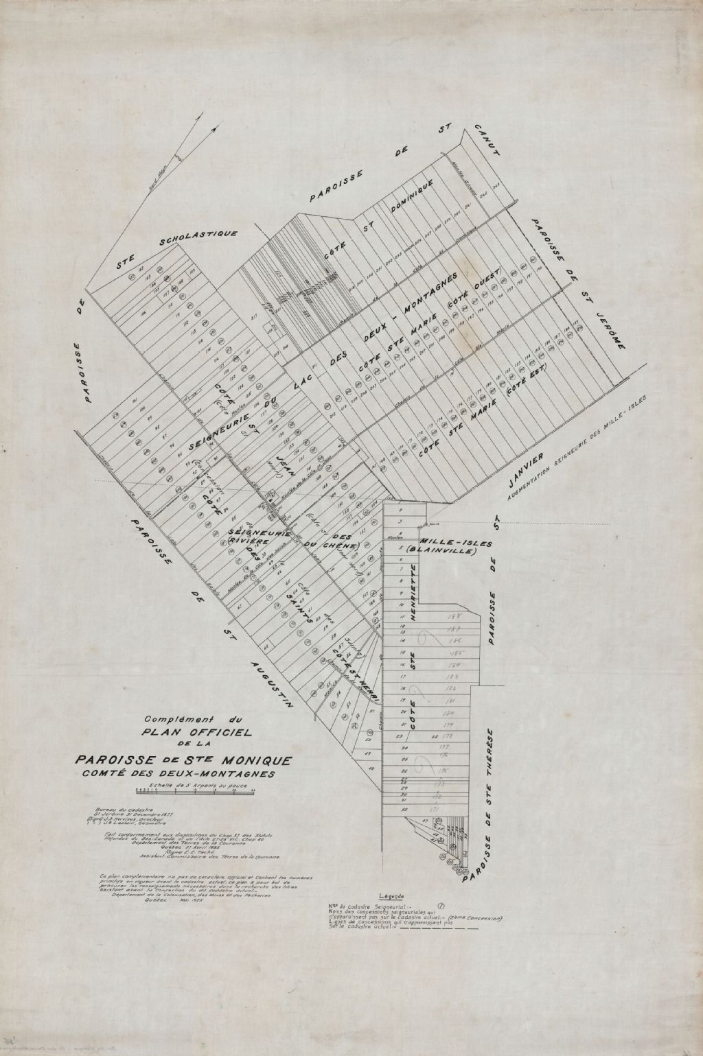 - Sur ce complément du plan officiel de la paroisse Sainte-Monique figurent une partie des seigneuries du Lac-des-Deux-Montagnes et Mille-Iles, les chemins de Sainte-Henriette, de Saint-Henri, de la Côte des Saints, de la Côte Saint-Jean, de la Côte Saint-Dominique, de la Côte Sainte-Marie et Giroux, le cadastre officiel et abrégé, les chemins, le nom des concessions et l'église