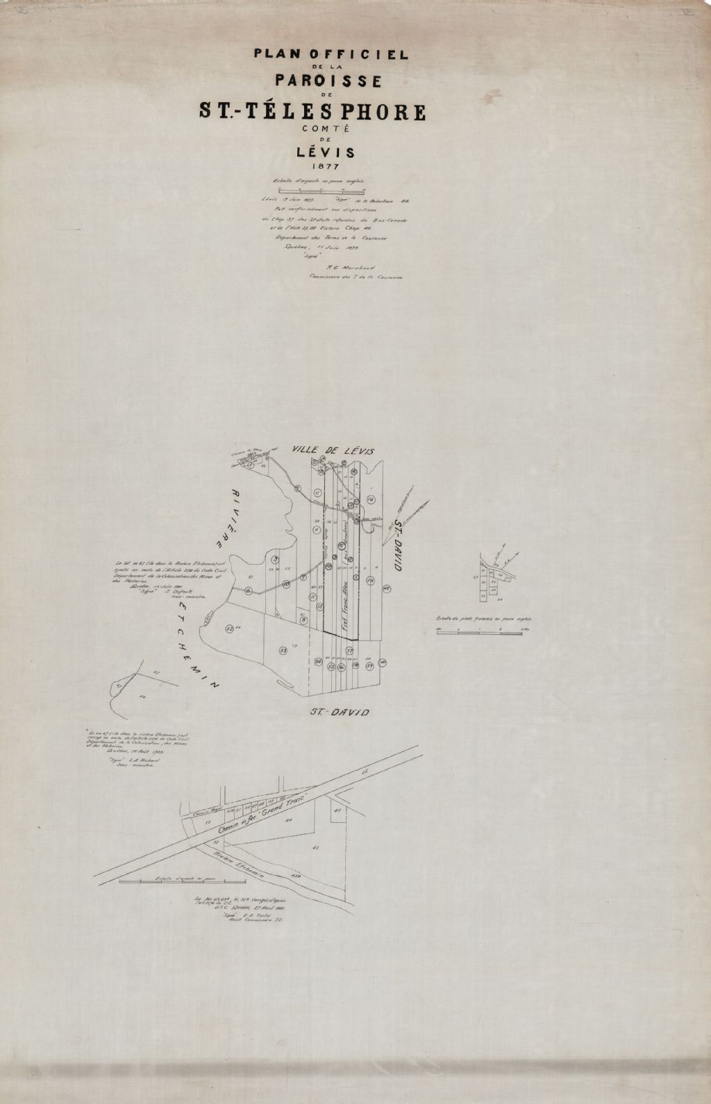Sur ce plan de la paroisse de Saint-Télésphore figurent la rivière Etchemin, les chemins Royal et du Fleuve, la route Cantin, l'arrière-fief des Ursulines, le cadastre officiel et abrégé, les chemins et le chemin de fer Grand Tronc
