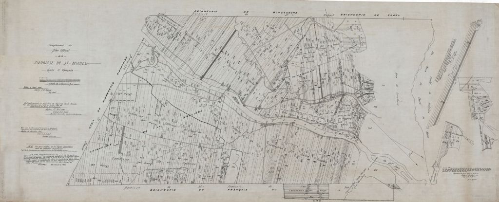 Sur ce complément du plan de la paroisse de Saint-Michel-d'Yamaska figurent la seigneurie de Yamaska, le chenal du Moine, les îles aux Érables et Saint-Jean, les rivières Yamaska, Saint-David et Saint-Louis, la baie Lavallière, le cadastre officiel, le cadastre abrégé, le nom des concessions, les chemins