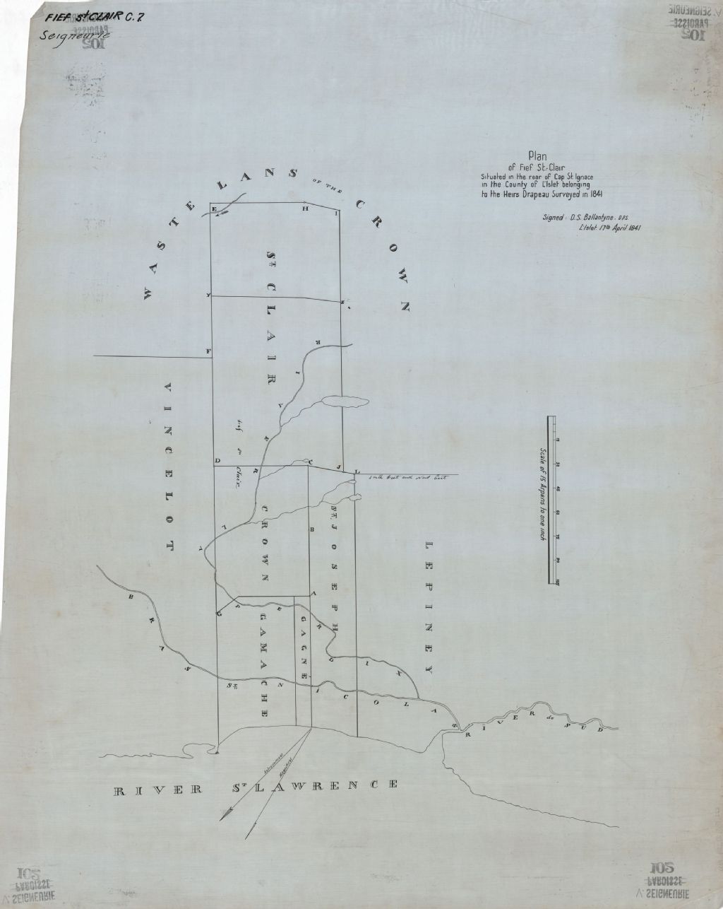 Plan of fief St.Clair situated in the rear of Cap St.Ignace in the county of L'Islet belonging to the heirs Drapeau surveyed in 1841