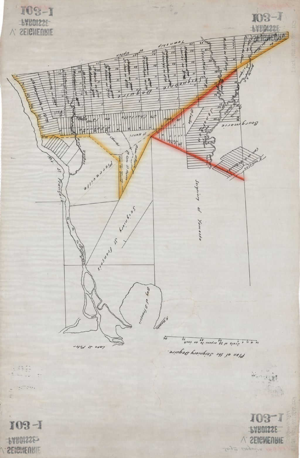 Sur ce plan de la seigneurie Deguire figurent la seigneurie Bourg-Marie-est, les rivières Saint-François et David, le réseau hydrographique, le nom des concessions et le nom Pères Jésuites