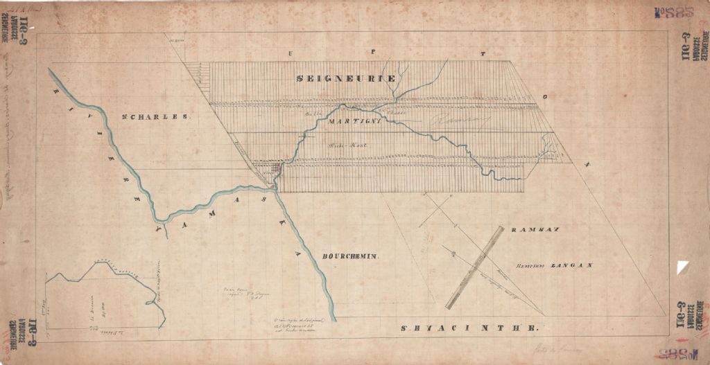 Sur ce plan de la seigneurie Ramsay figurent les numéros de lots qui appartiennent à Hugues Lemoine de "Martigny" qui ont été arpentés par Emmanuël Couillard-Desprès qui sont situés dans la paroisse Saint-Hugues. Figurent également, le manoir, un moulin à farine et un moulin à scie sur la rivière Chibouet. Une partie de la rivière Yamaska est aussi représentée