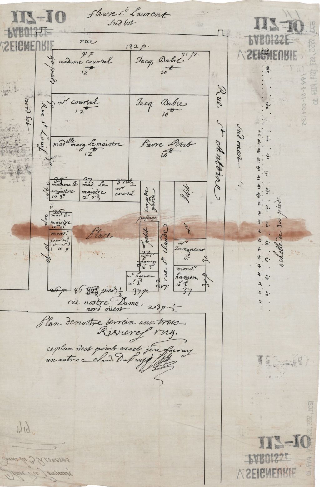 Sur ce plan d'un secteur de Trois-Rivières figurent les rues Notre-Dame, Saint-Antoine, Saint-Louis et Saint-Claude; on y voit la grande Place, l'endroit où se situe le corps de garde, une partie du fleuve Saint-Laurent ainsi que les noms d'individus suivants: Courval, Marguerite Lemaistre, Jacques Babie, Pierre Petit, Hamon et Tonnancour