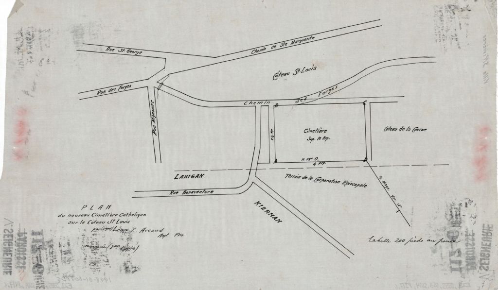 Sur ce plan figurent les limites extérieures du cimetière, le terrain de la Corporation Épiscopale, les chemins Sainte-Marguerite et des Forges; les rues suivantes: Saint-George, Bonaventure, des Forges et Mignonne ainsi que les noms Lanigan et Kiernan