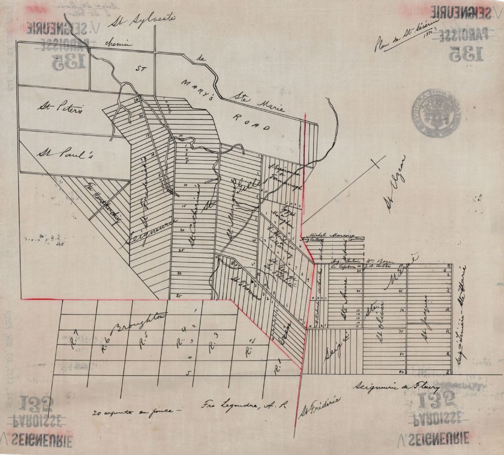 Sur ce plan de la paroisse de Saint-Séverin figurent les seigneuries Saint-Gilles et Sainte-Marie, le nom des concessions, les chemin et environ 10 noms de propriétaires
