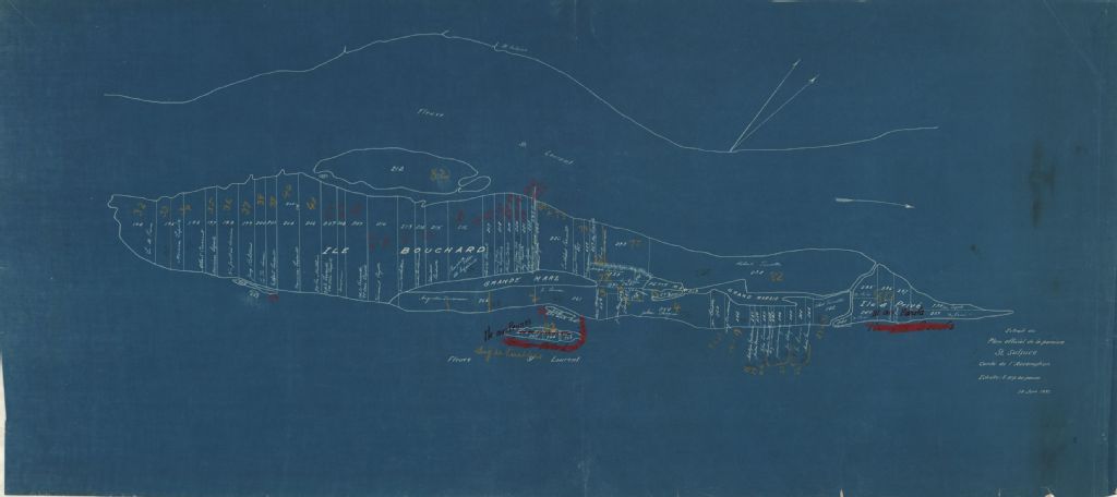 Sur ce plan de la paroisse Saint-Sulpice figurent la seigneurie des Iles-Bouchard, une partie du fleuve Saint-Laurent, l' île aux Prunes, l'île aux Boeufs, l'île Bouchard, l'île aux rats, un marais, le cadastre seigneurial et environ 50 noms de propriétaires