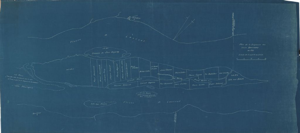 Sur ce plan de la seigneurie des Iles-Bouchard figurent une partie du fleuve Saint-Laurent, l'Ile-aux-Prunes, l'Ile-aux-Boeufs, l'Ile-Bouchard, les églises, un moulin et environ 25 noms de propriétaires. Le texte dactylographié de l'aveu et dénombrement des Isles Bouchard, signé par Michel Bégon et François Desjordy, accompagne le plan