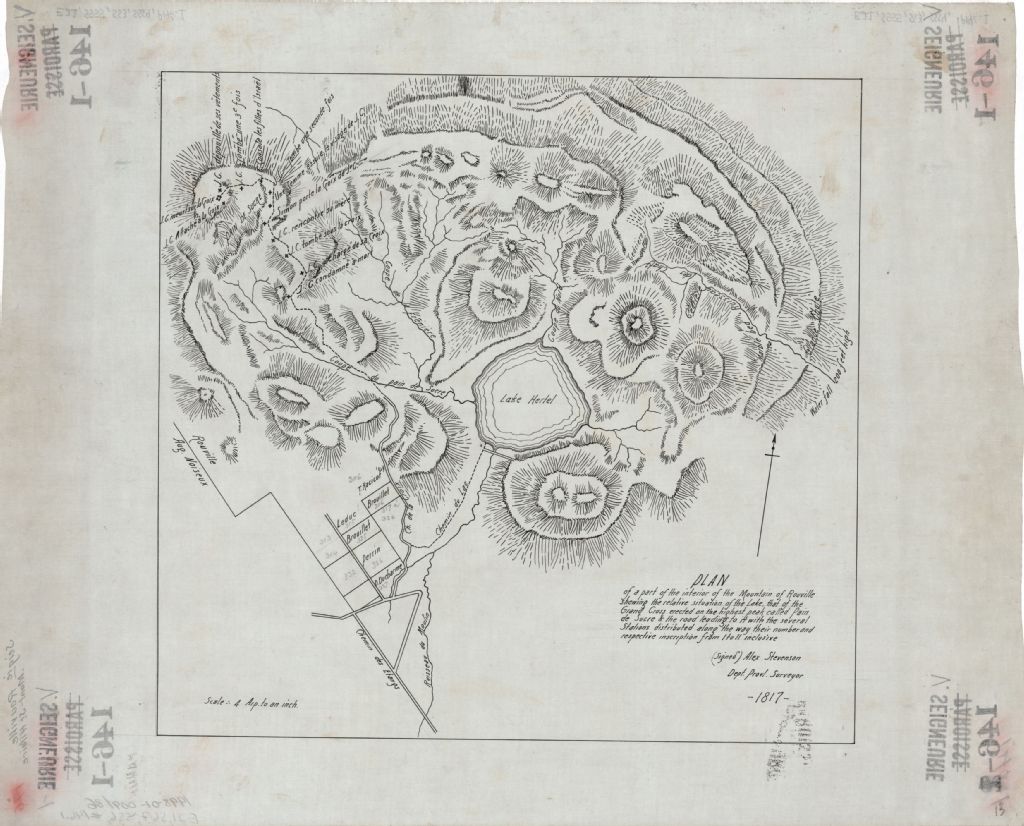 Plan of a part of seigniory Rouville shewing the relative situation of the lake, that of the Grand Cross erected on the highest peak called Pain de Sucre and the road leading to it with the several stations ditributed along the way their number and respective inscription from I to II inclusive