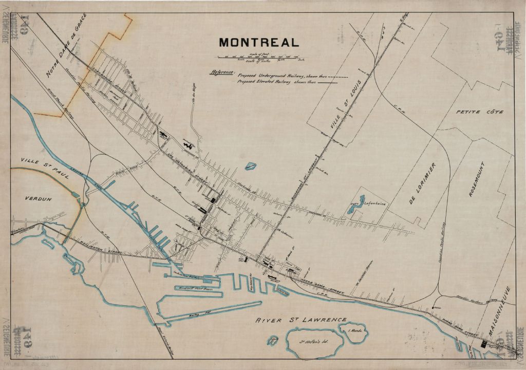 Sur ce plan de la ville de Montréal figurent une partie du fleuve Saint-Laurent, le canal de Lachine, les chemin de fer, le tramway, les bâtiments, les quais, l'église, le marché, les gares et les noms Grand Trunk Rly, Canadian Pacific Rly et Canadian Northern Rly