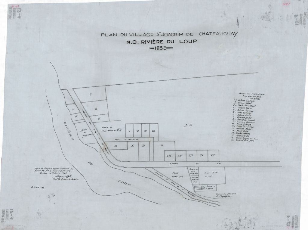 Plan d'une partie de la seigneurie de Châteauguay sur lequel figure le village Saint-Joachim de Châteauguay N.O. rivière du Loup, 1852
