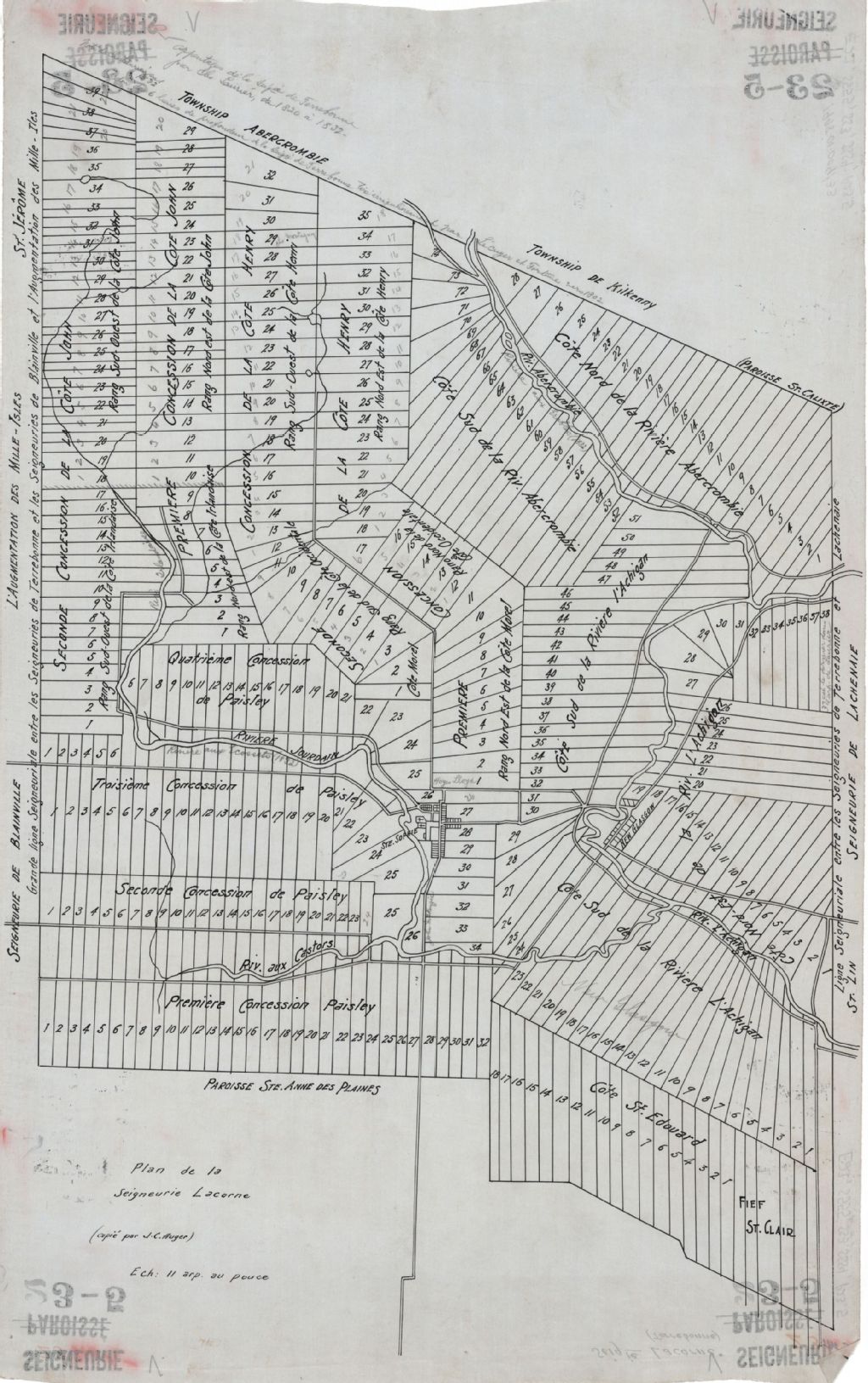 - Sur ce plan d'une partie de la seigneurie Lacorne figurent l'arrière-fief de Sainte-Claire, le village de New Glasgow, la paroisse de Sainte-Sophie, les rivières Abercromby, Jourdain et de l'Achigan et le ruisseau aux Castors