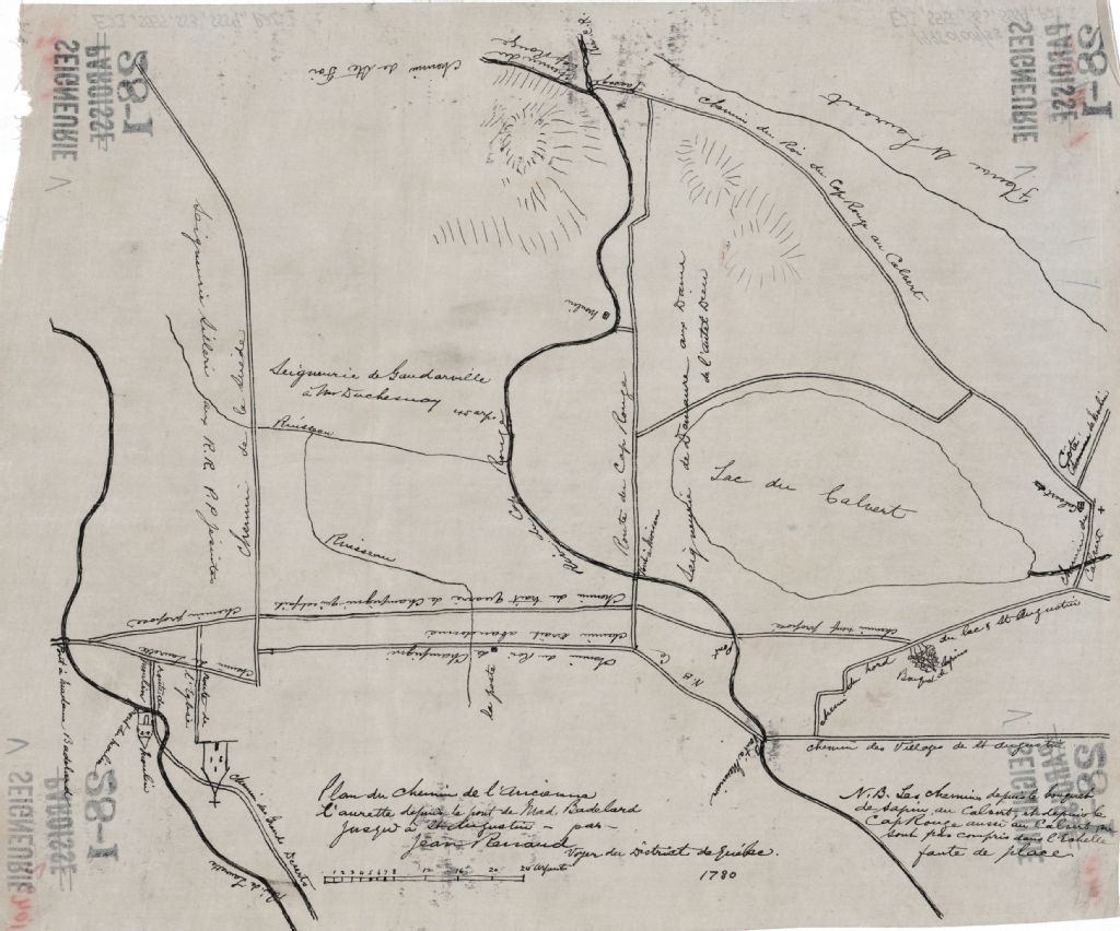 Plan relatif à une partie de la seigneurie de Maur figure le chemin de l'Ancienne L'Aurette (Lorette) depuis le pont de Mad. Badelard jusqu'à Saint-Augustin.