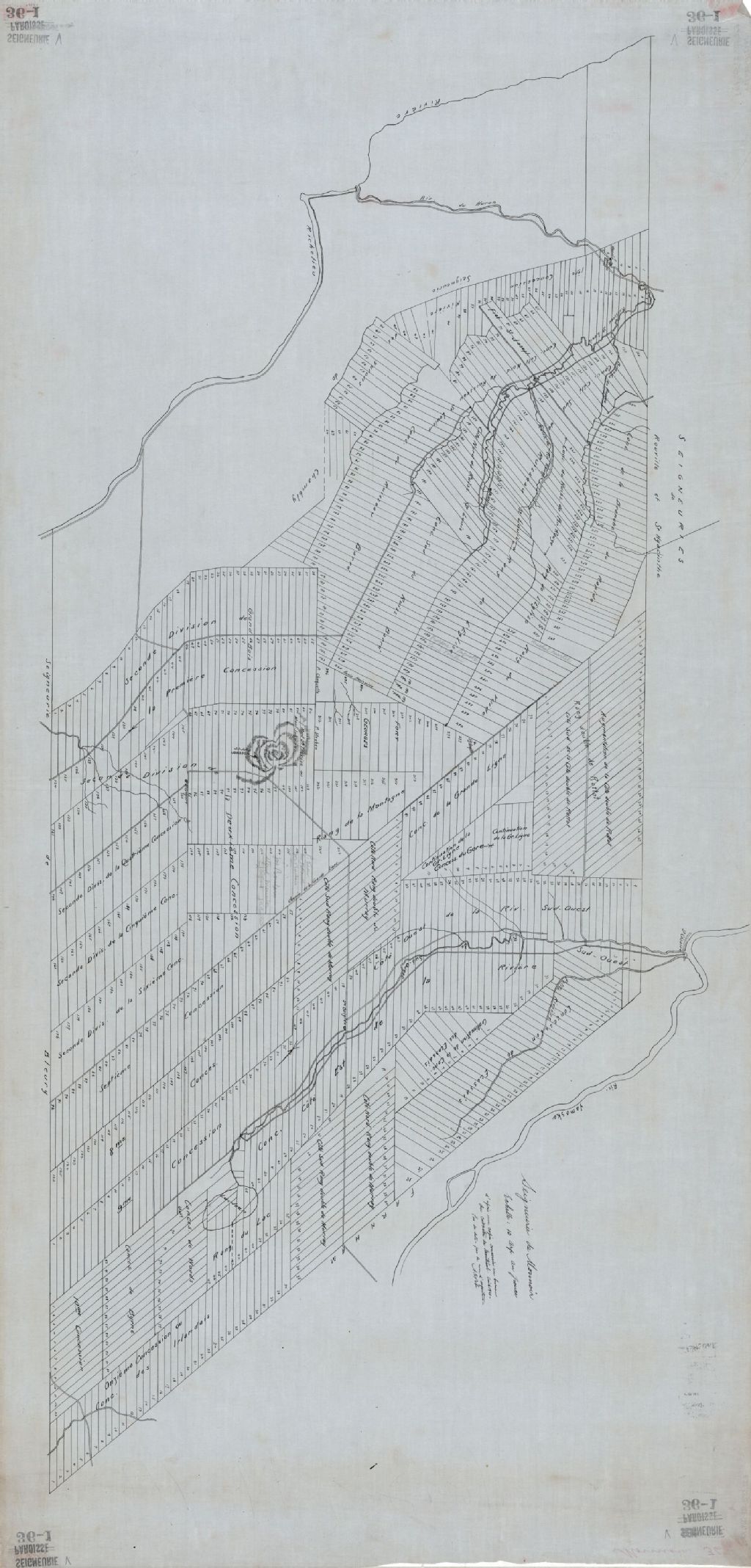 Sur ce plan de la seigneurie de Monnoir figurent une partie des rivières Richelieu et Yamaska, les rivières des Hurons, du Sud-Ouest et des Écossais, les ruisseaux Saint-Louis, du Pin et de la Branche du Rapide, Rouge le mont Saint-Grégoire (montagne Sainte-Thérèse ou mont Johnson), le réseau hydrographique, les chemins, le nom des concessions, le relief, l'église, le manoir, le moulin banal, le bâtiment, le nom des paroisses, les limites de la seigneurie, environ 12 noms de propriétaires et le nom John Johnson