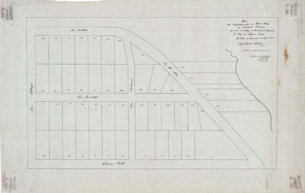 Plan des emplacements ou lots à bâtir de Ambroise Laberge au n.o. du village de Sainte-Marie de Monnoir le long du chemin Ponté.