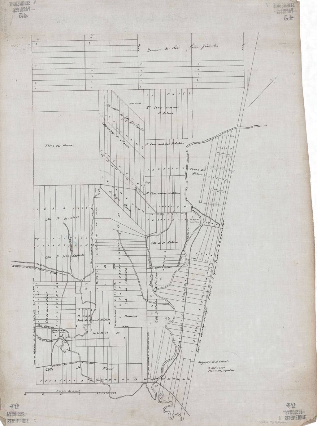 Sur ce plan de la seigneurie Saint-Gabriel figurent une partie de la rivière Saint-Charles les ruisseaux Geneviève et de l'Ormière, la rivière Lorette, le nom des concessions, le réseau hydrographique, les chemins, la réserve indienne de quarante arpents, l'emplacement occupé par les Amérindiens, le domaine, la dimension des lots, la nation huronne et les noms Révérends Pères Jésuite et Les Hurons