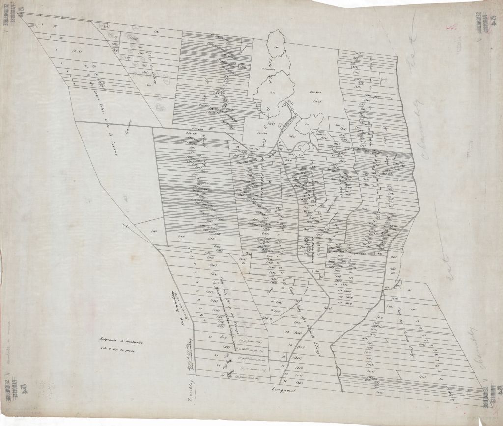 Sur ce plan de la seigneurie de Montarville figurent le lac Seigneur, le nom des concessions, le cadastre seigneurial et officiel, les chemins, les lacs, les bâtiments et le domaine seigneurial
