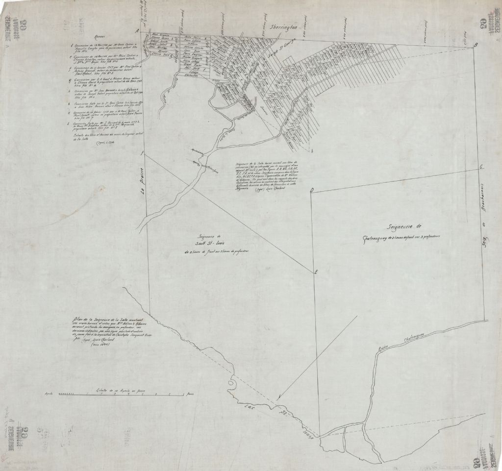 Plan de la seigneurie de La Salle montrant ses vraies bornes et celles que Mrs Watson & Kilborn auraient prétendu lui assigné en profondeur, ces dernières indiquées par une ligne ponctuée et ombrée de jaune fait à la réquisition de Christophe Sanguinet, écuier; partie nord-est de la seigneurie de La Salle.
