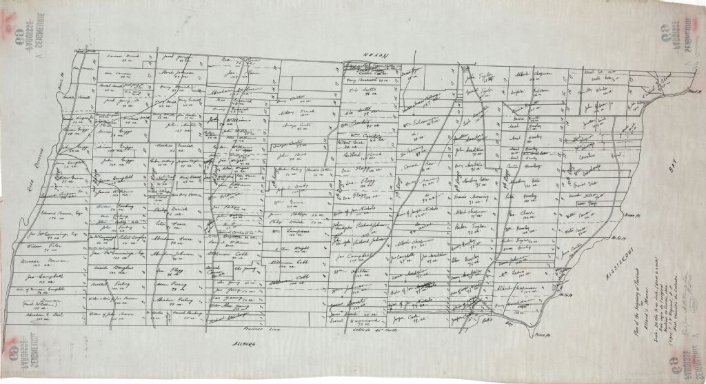 Sur ce plan de la seigneurie Foucault figurent la baie Missisquoi, la rivière Richelieu, la dimension des lots, les chemins, les toponymes et environ 200 noms de propriétaires