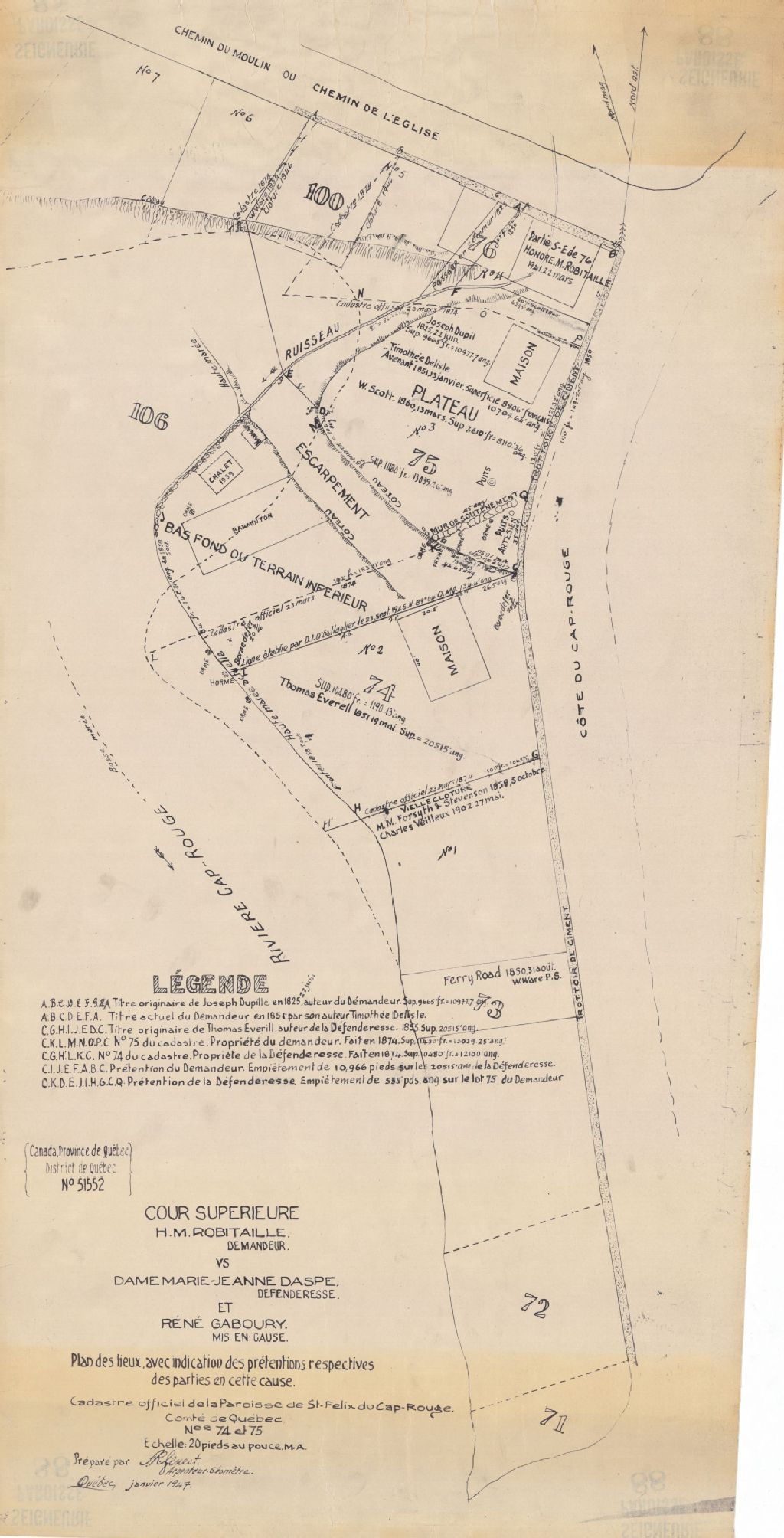 Plan et cadastre officiel de la paroisse de Saint-Félix du Cap-Rouge, nos 74 et 75. Plan des lieux avec indications des prétentions respectives des parties en cette cause. Cour supérieure: H.M. Robitaille demandeur vs dame Marie-Jeanne Daspé, défenderesse et René Gaboury.
