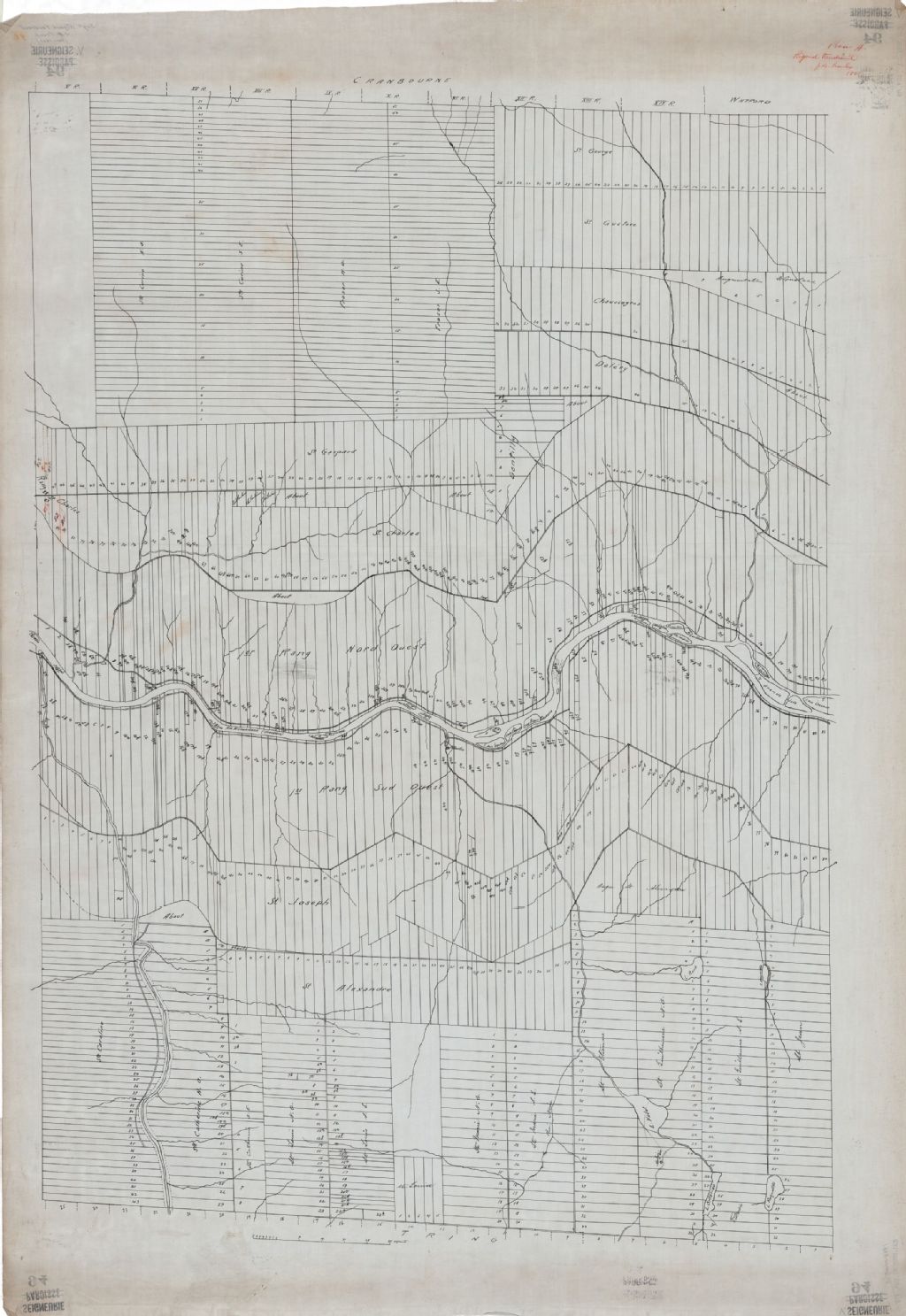 Sur ce plan de la seigneurie Rigaud-de-Vaudreuil figurent les rivières Chaudière ou Michakikane, du Moulin, Gilbert et des Plantes, le Bras du Sud-Ouest, le nom des concessions, les moulins, l'église, les îles, les chemins et le réseau hydrographique