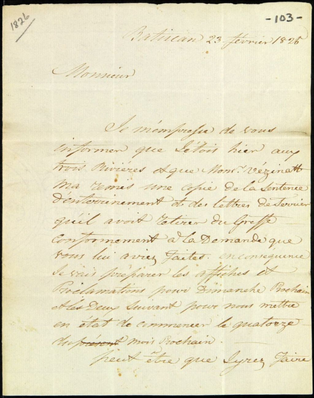 Lettre de Louis Guillet, notaire public, à Lewis Foy, de Québec, au sujet de la confection d'un papier-terrier de la seigneurie de Batiscan, 23 février 1825, Archives nationales à Québec, Fonds Ministère des Terres et Forêts, (03Q,E21,S64,SS5,SSS10,D103).