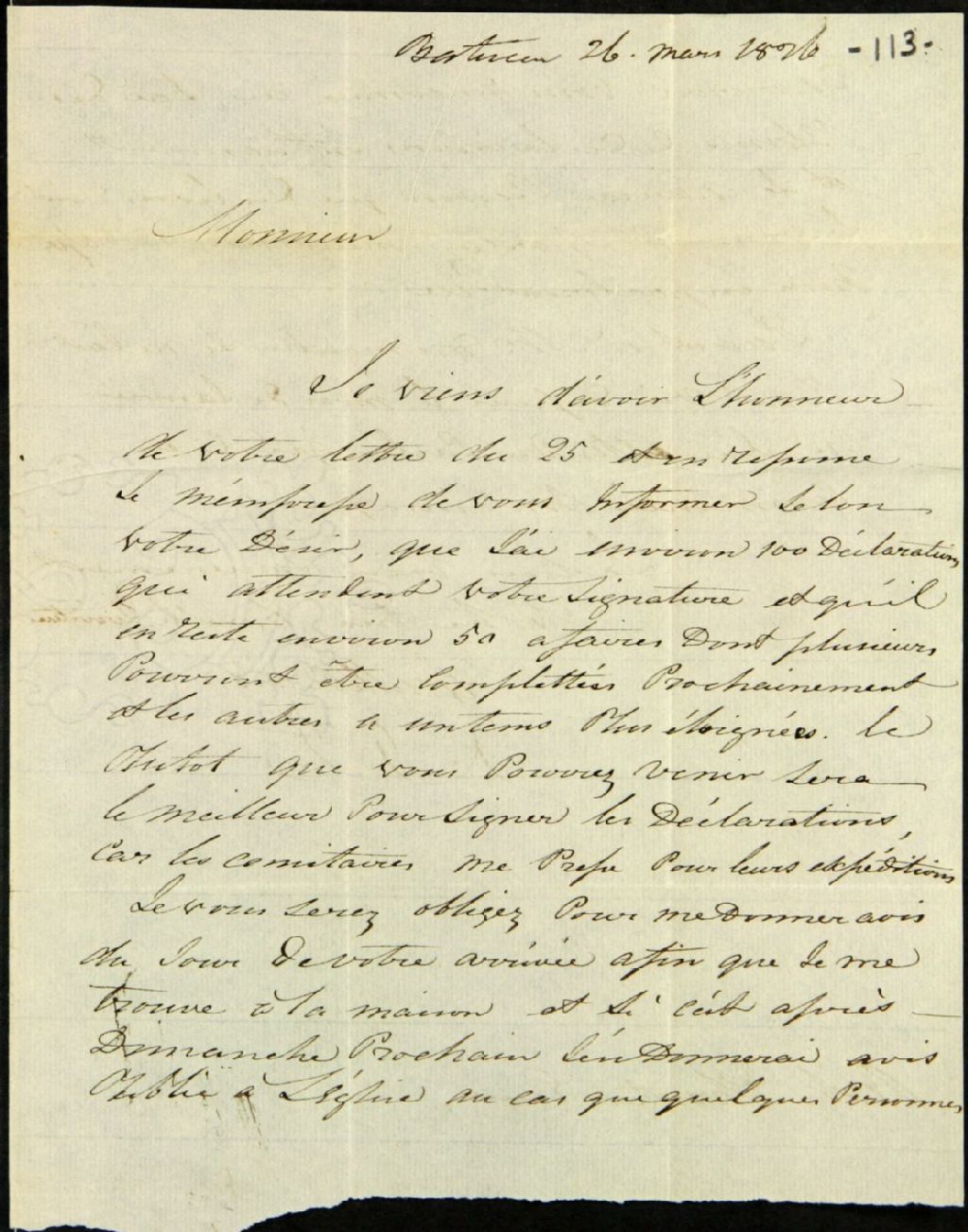 Lettre de Louis Guillet, notaire public, de Batiscan, à Robert Christie, de Québec, au sujet de la confection d'un papier-terrier de la seigneurie de Batiscan, 26 mars 1826, Archives nationales à Québec, Fonds Ministère des Terres et Forêts, (03Q,E21,S64,SS5,SSS10,D113).