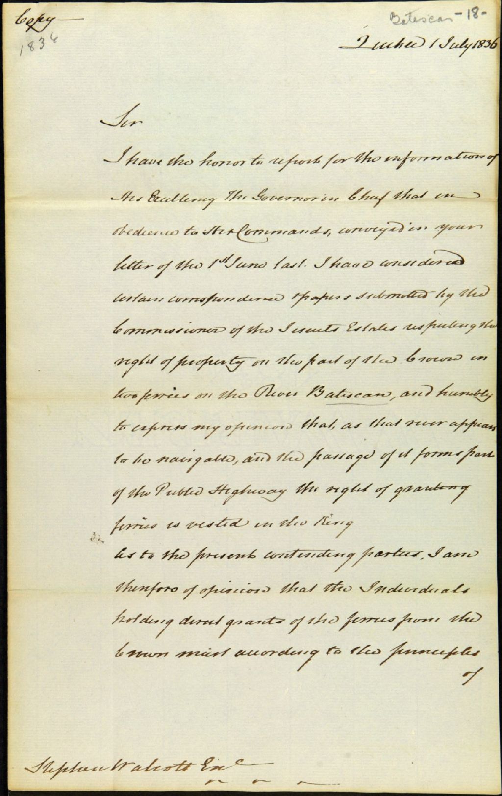 Lettre de Charles Richard Ogden, procureur général, à Stephen Walcott, secrétaire civil, au sujet des droits de propriété sur deux traverses sur la rivière Batiscan, 1er juillet 1836, Archives nationales à Québec, Fonds Ministère des Terres et Forêts, (03Q,E21,S64,SS5,SSS10,D18).