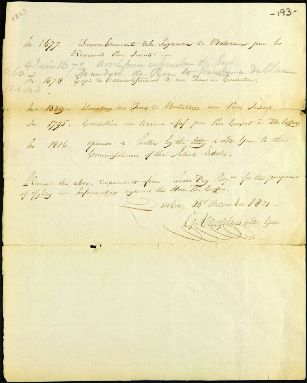 Liste de documents concernant la seigneurie de Batiscan expédiés par Lewis Foy, à George Vanfelson, avocat général de la province du Bas-Canada, dans la cause contre Thomas Coffin