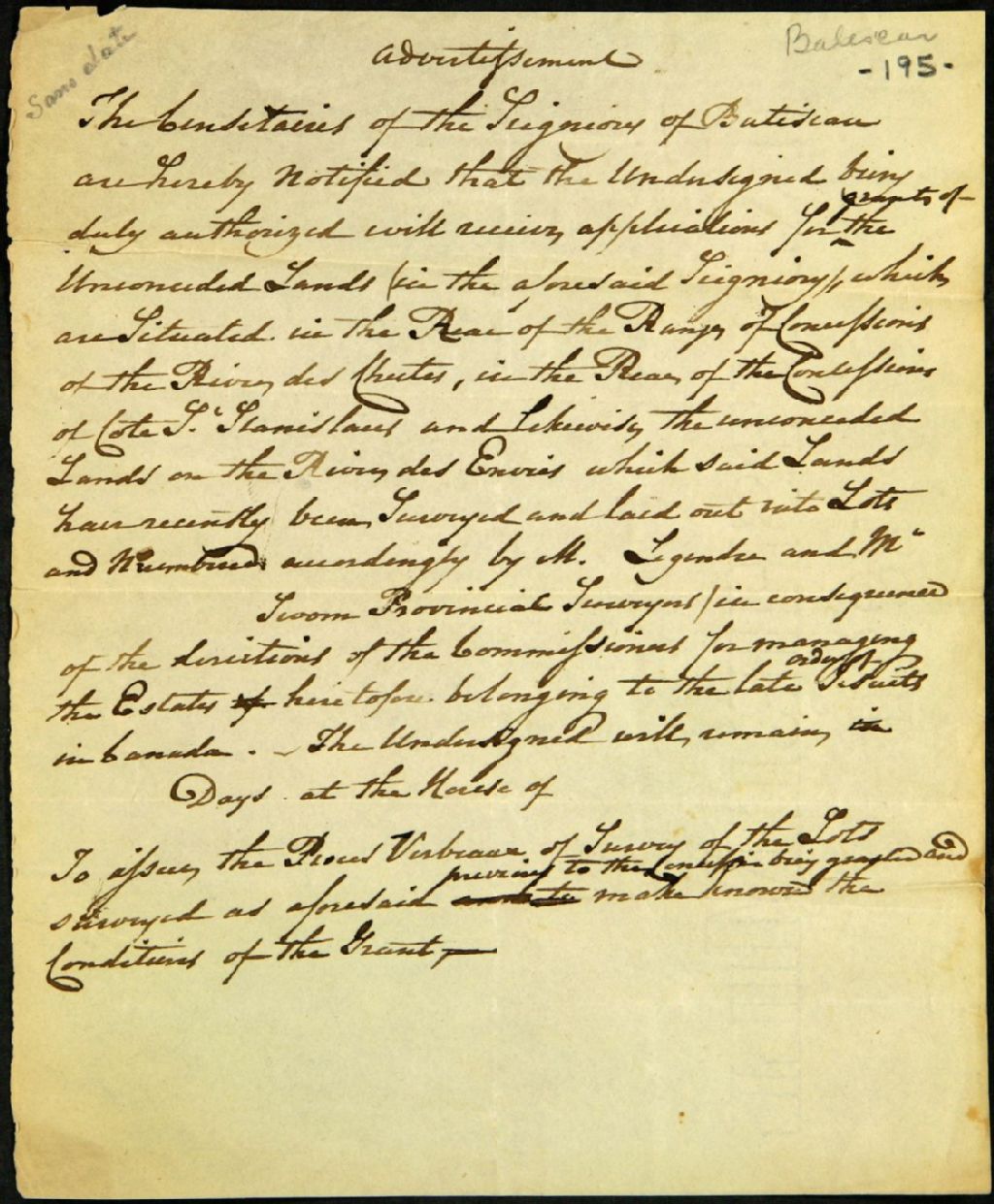 Avertissement adressé aux censitaires de la seigneurie de Batiscan que des terres seront concédées dans la profondeur des rangs de la rivière des Chutes, de la côte Saint-Stanislas et de la rivière des Envies, 1800 - 1900, Archives nationales à Québec, Fonds Ministère des Terres et Forêts, (03Q,E21,S64,SS5,SSS10,D195).