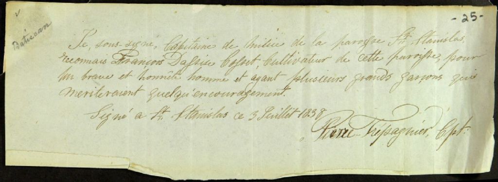 Pétition de François d'Assise Cossette, cultivateur de la paroisse Saint-Stanislas de Batiscan, au comte de Durham, vicomte de Lambton, chevalier grand croix de l'ordre militaire du Bain, conseiller de Sa Majesté au Conseil privé, gouverneur général, vice-amiral et capitaine général de toutes les provincves de Sa Majesté, pour obtenir des terres au lac Kippiboucheka située à cinq lieues dans le nord des derniers habitants de la paroisse Saint-Stanislas de Batiscan, 14 août 1838, Archives nationales à Québec, Fonds Ministère des Terres et Forêts, (03Q,E21,S64,SS5,SSS10,D25).