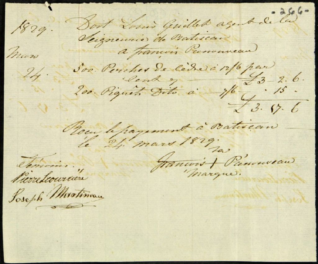 Reçu de François Prénouveau, de Batiscan, à Louis Guillet, agent des biens des Jésuites pour la seigneurie de Batiscan, pour livraison de piquets de cèdre