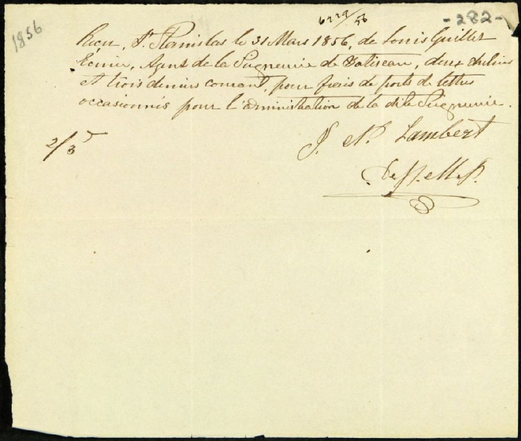- Reçus de J.N. Lambert, maître de poste, Louis Guillet, notaire public, Robert Trudel, notaire public, Ferdinand Filteau, notaire public, Robert Trudel, secrétaire-trésorier de Sainte-Geneviève-de-Batiscan, et des propriétaires du steamer < British Queen >, à Louis Guillet, agent des biens des Jésuites pour la seigneurie de Batiscan
