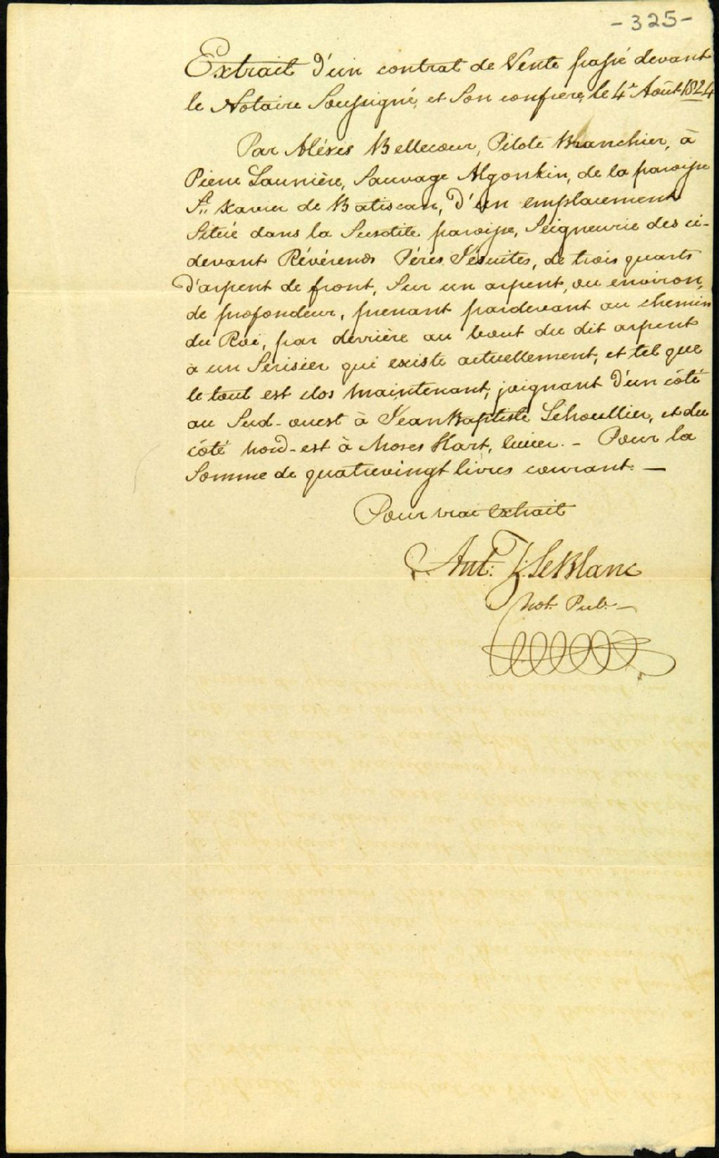 Extrait d'un contrat de vente d'un emplacement situé en la paroisse Saint-François-Xavier-de-Batiscan, par Alexis Bellecoeur, pilote branché, à Pierre Launière, sauvage algonquin, de ladite paroisse, 4 août 1824, Archives nationales à Québec, Fonds Ministère des Terres et Forêts, (03Q,E21,S64,SS5,SSS10,D325).