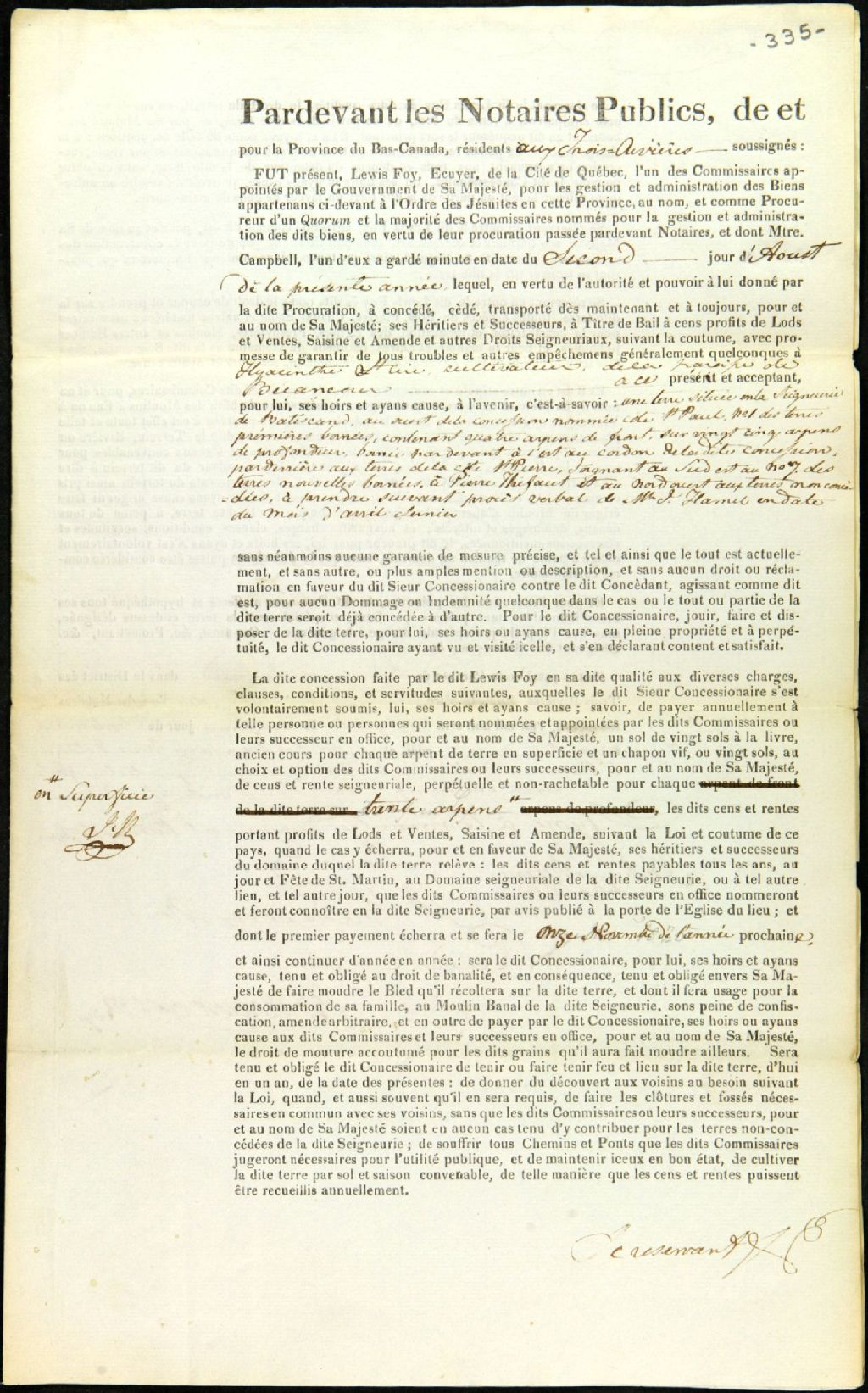 Le contrat a été rédigé par le notaire Joseph Badeaux, de Trois-Rivières