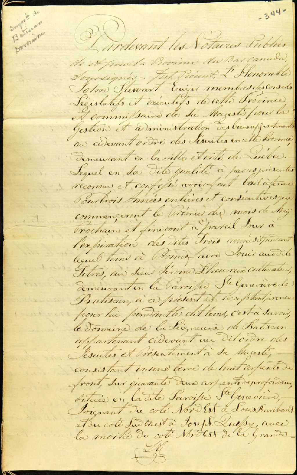- Bail à ferme (3 ans) du domaine de la seigneurie de Batiscan situé en la paroisse Sainte-Geneviève ; par John Stewart, membre des conseils législatif et exécutif de cette province et commissaire des biens des Jésuites, de la ville de Québec, à Jérôme L'Heureux, cultivateur, de la paroisse Sainte-Geneviève-de-Batiscan