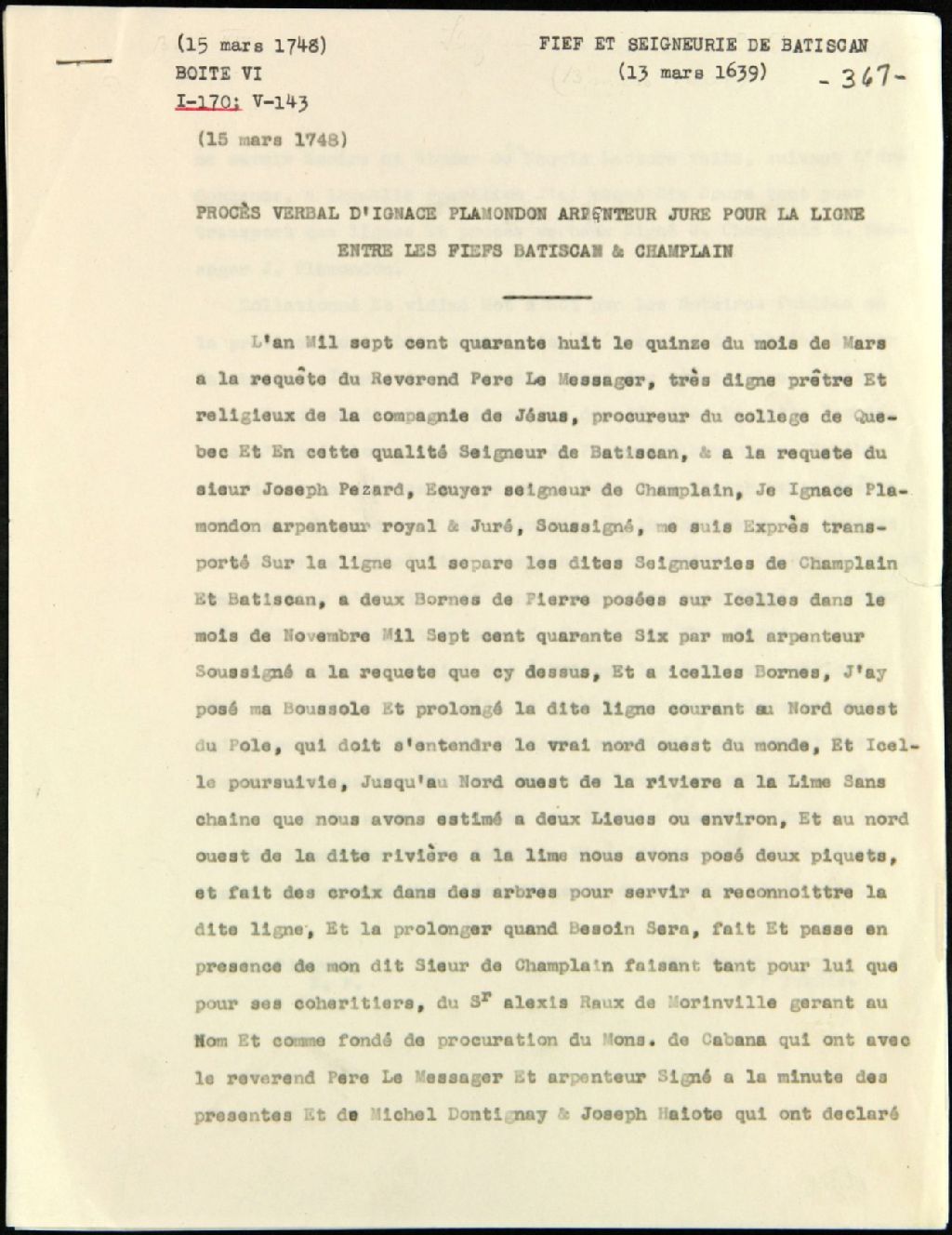 Collation d'un procès-verbal d'arpentage des lignes qui séparent les seigneuries de Champlain et de Batiscan, à la requête du Révérend père Le Messager, prêtre de la Compagnie de Jésus, procureur du Collège de Québec, seigneur de Batiscan ; et de Joseph Pezard, seigneur de Champlain, 15 mars 1748, Archives nationales à Québec, Fonds Ministère des Terres et Forêts, (03Q,E21,S64,SS5,SSS10,D367).