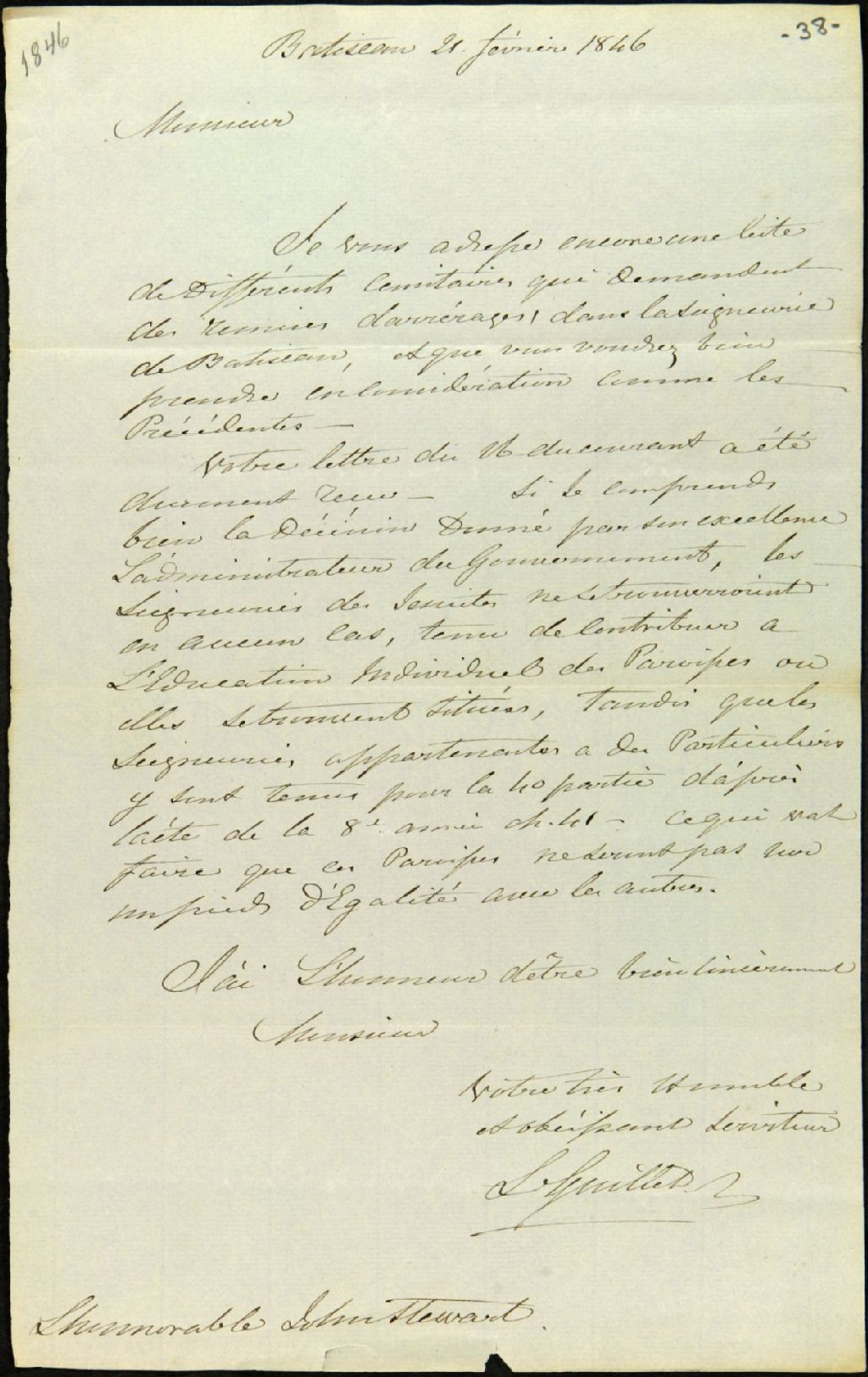 Lettre de Louis Guillet, agent des biens des Jésuites pour le district des Trois-Rivières, de Batiscan, à John Stewart, commissaire des biens des Jésuites, de Québec, fournissant une liste des différents censitaires qui demandent des remises d'arrérages dans la seigneurie de Batiscan, 21 février 1846, Archives nationales à Québec, Fonds Ministère des Terres et Forêts, (03Q,E21,S64,SS5,SSS10,D38).