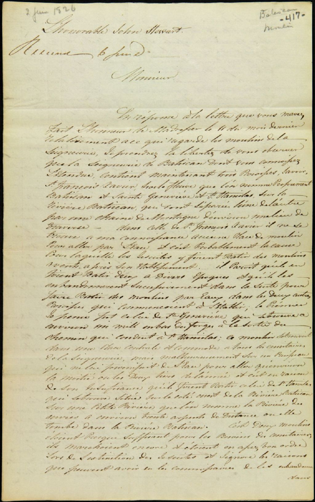 - Lettre de Louis Guillet, notaire public et agent des biens des Jésuites pour le district des Trois-Rivières, à John Stewart, commissaire des biens des Jésuites, de la ville de Québec, au sujet des moulins de la seigneurie de Batiscan