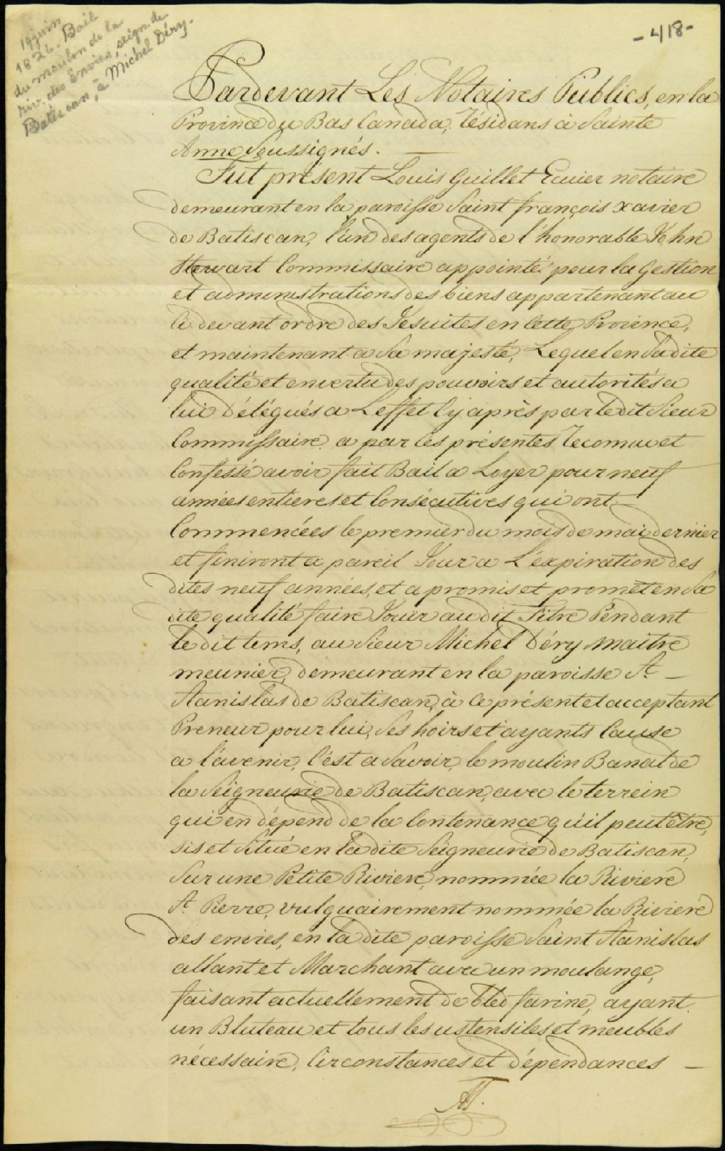 Bail à loyer (9 ans) du moulin banal de la seigneurie de Batiscan situé sur une petite rivière nommée la rivière Saint-Pierre vulgairement nommée la rivière des Envies en la paroisse Saint-Stanislas ; par Louis Guillet, notaire public et agent des biens des Jésuites pour le district des Trois-Rivières, demeurant en la paroisse Saint-François-Xavier-de-Batiscan, à Michel Déry, maître meunier, de la paroisse Saint-Stanislas-de-Batiscan