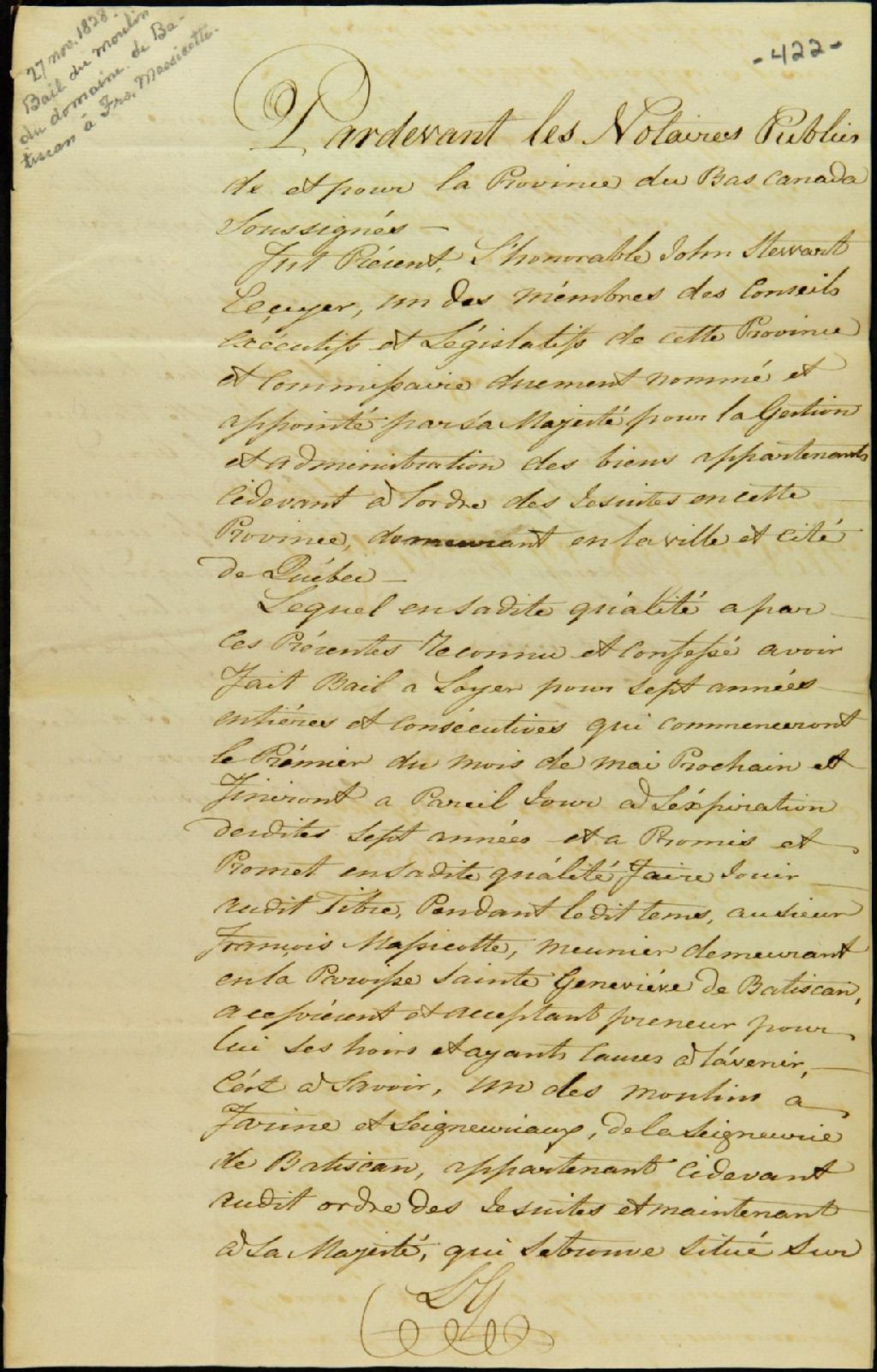 - Bail à loyer (7 ans) de l'un des moulins à farine de la seigneurie de Batiscan qui se trouve situé sur le domaine de ladite seigneurie en la paroisse Sainte-Geneviève sur le côté nord de la rivière Batiscan ; par John Stewart, un des membres des conseils législatif et exécutif de cette province et commissaire des biens des Jésuites, de la ville de Québec, à François Massicotte, meunier, de la paroisse Sainte-Geneviève-de-Batiscan