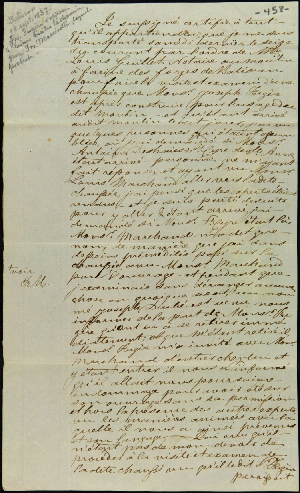 Certificat de visite d'une chaussée au moulin à farine des forges de Batiscan par François Massicotte, charpentier, de la paroisse Saint-François-Xavier-de-Batiscan, 18 septembre 1837, Archives nationales à Québec, Fonds Ministère des Terres et Forêts, (03Q,E21,S64,SS5,SSS10,D458).
