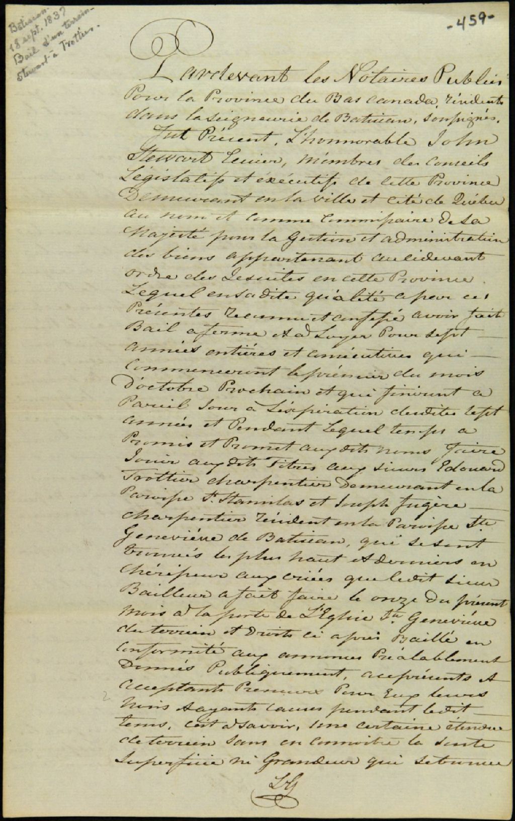 Bail à loyer (7 ans) d'une certaine étendue de terrain située dans la seigneurie de Batiscan ; par John Stewart, membre des conseils législatif et exécutif de cette province et commissaire des biens des Jésuites, de la ville de Québec, à Edouard Trottier, charpentier, de la paroisse Saint-Stanislas, et Joseph Fugère, charpentier, de la paroisse Sainte-Geneviève-de-Batiscan, 18 septembre 1837, Archives nationales à Québec, Fonds Ministère des Terres et Forêts, (03Q,E21,S64,SS5,SSS10,D459).